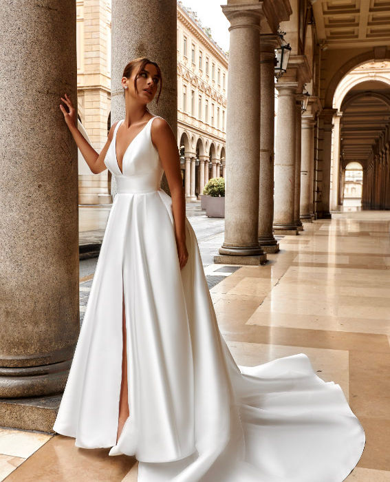 Abito in mikado, gonna a portafoglio con spacco e corpino strutturato.