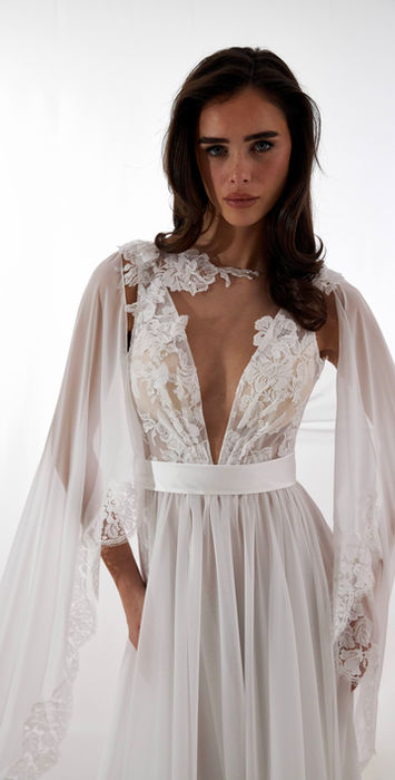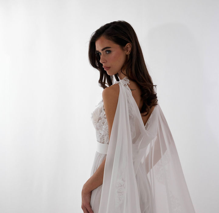 Gonna in chiffon e corpino in pizzo Francese con applicazioni in rilievo e ricamo in Swarovski. Cintura a vita in satin. A completare il look una lunga Cappa in chiffon lunga 3 mt con bordo in pizzo Francese intagliato interamente a mano.