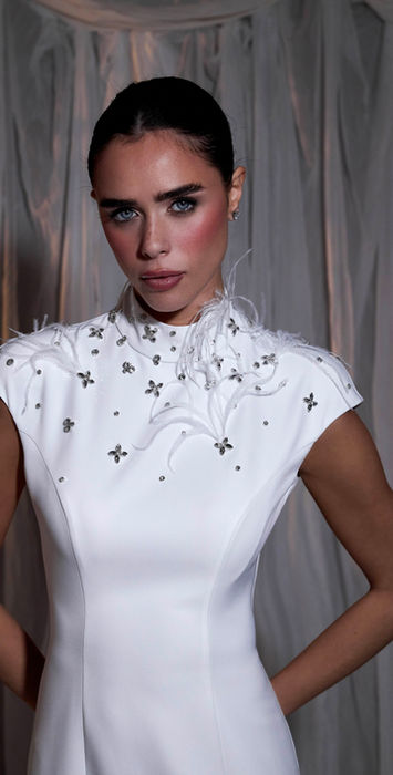 Abito a sirena in crêpe con collo alto e profonda scollatura sulla schiena, interamente ricamato a mano con cristalli e impreziosito da ciuffi di piume di struzzo.