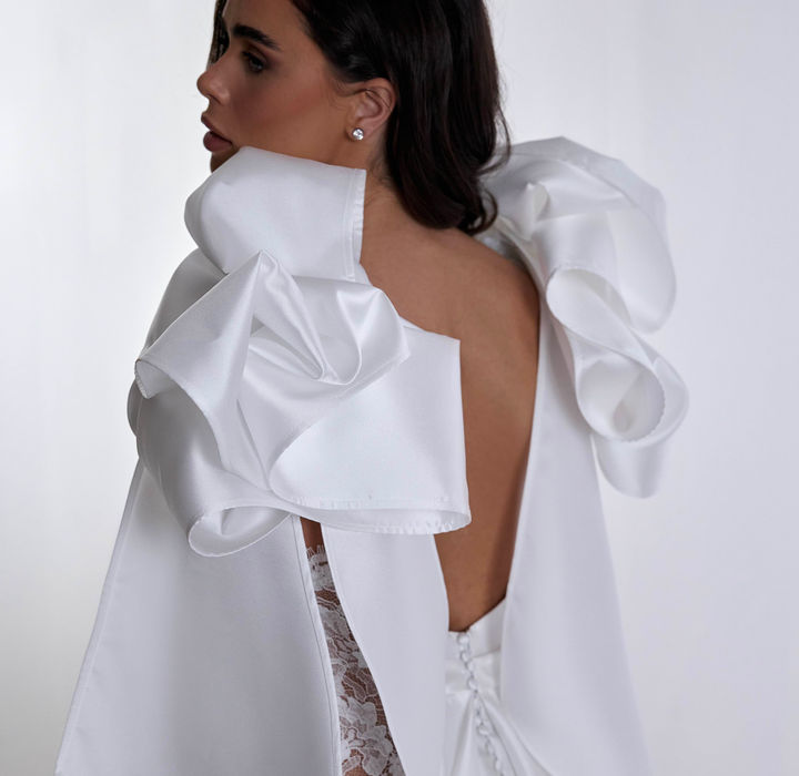 Abito ampio in mikado con corpino strutturato e gonna a palloncino, arricchito da fiocchi sulle spalle in mikado.